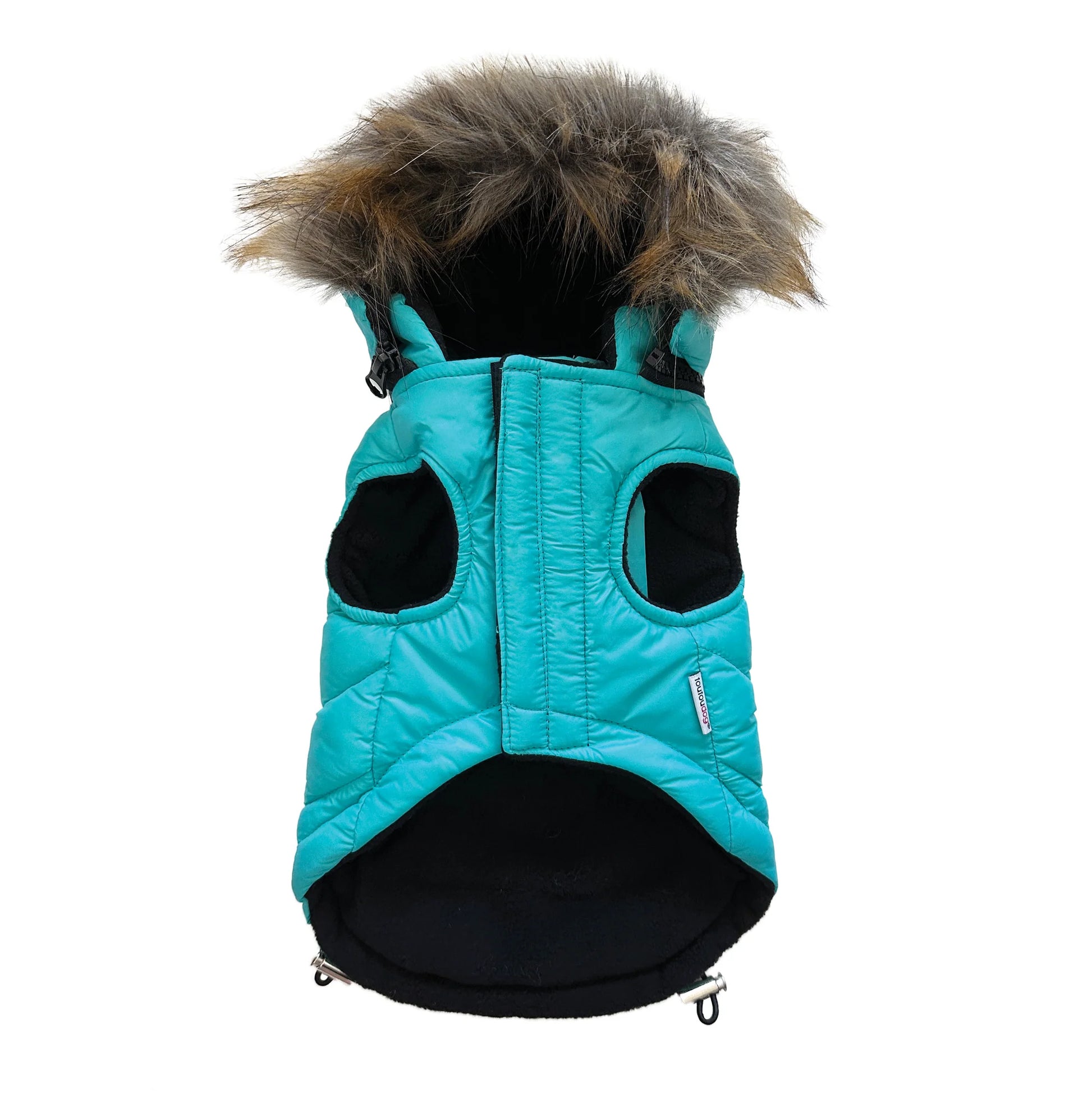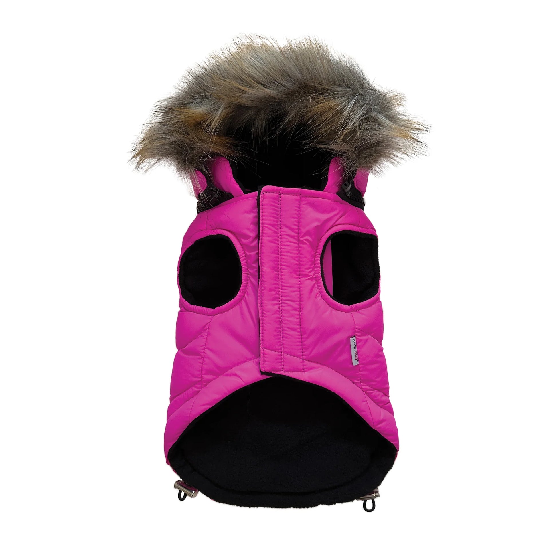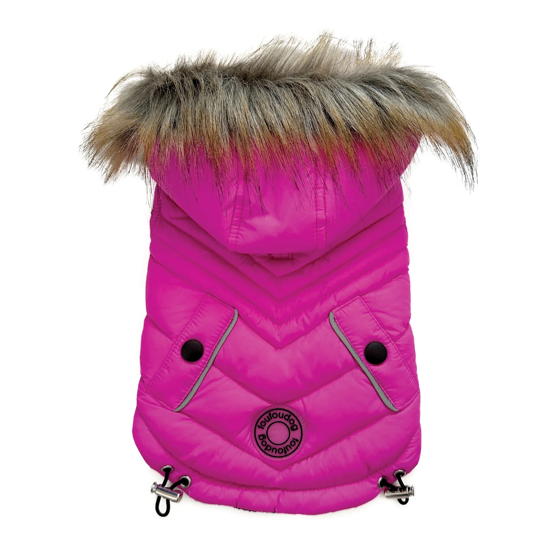 You won’t get lost in the snow, with our newest parka! The Neon Fouski is available in 3 ultra vibrant colors. It features faux pockets, a sporty quilted arrow pattern, and our signature rubber logo. Reflective piping on the pockets are added for safety. We have added a zippered harness hole and drawstrings to ensure a perfect fit. The velcro closure is double wide to accommodate larger chests. The faux fur trimmed hood is fully removable, and entire coat is water resistant and lined with a warm fleece.