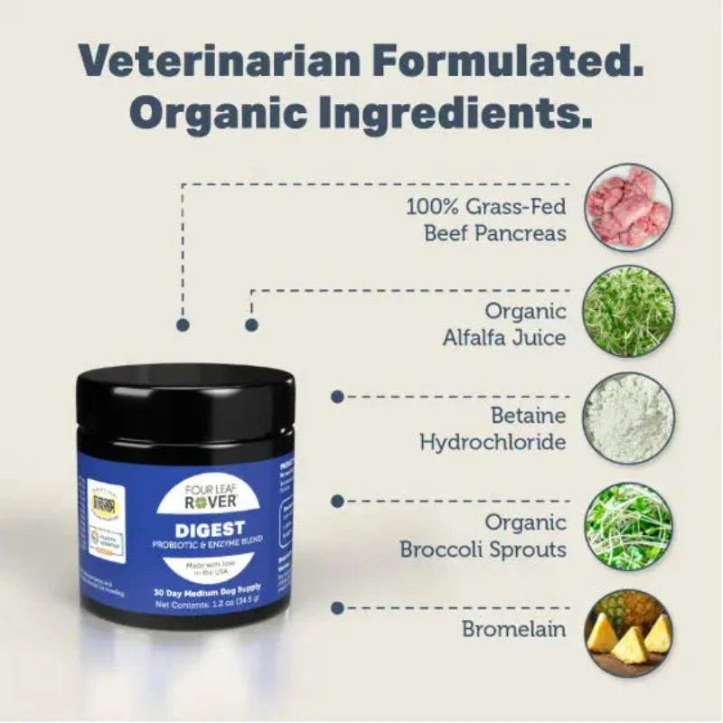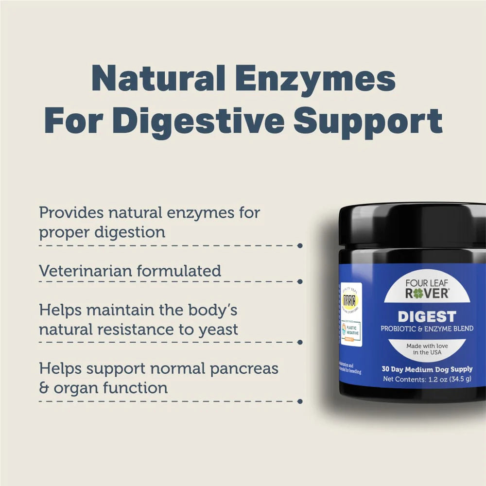 Digest is a natural supply of digestive enzymes dogs need, bovine pancreas and soil-based probiotics to support a healthy gut and digestion.