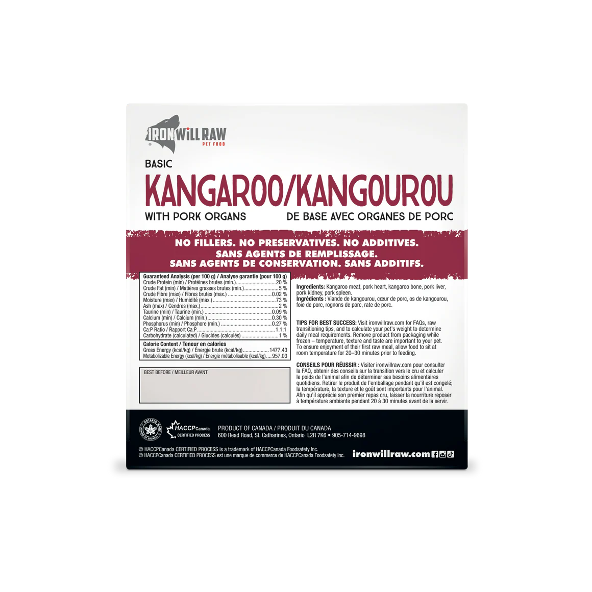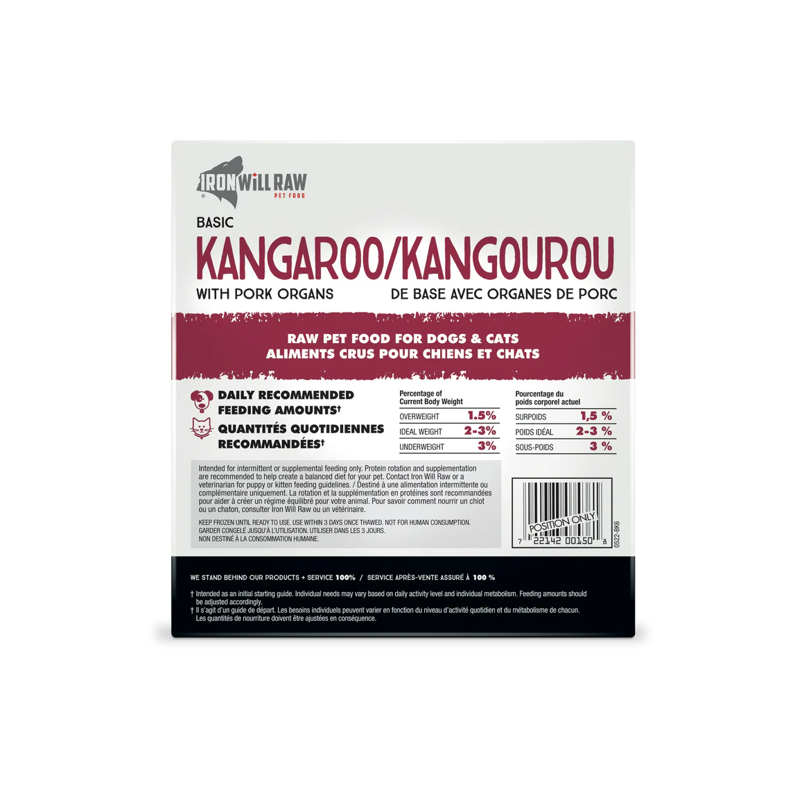 Kangaroo is low fat and free-range making Iron Will Raw Basic Kangaroo with Pork Organs ideal for pets with food allergies and intolerances.